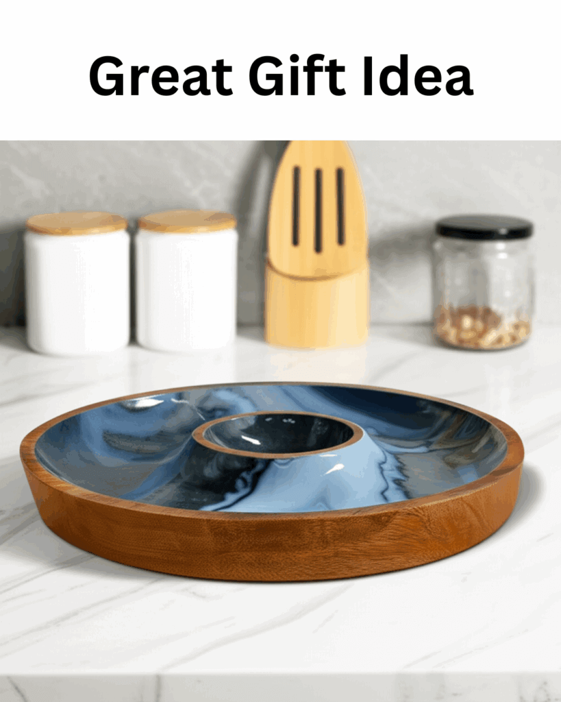 The tray’s rich wood grain and captivating marbled resin design make it a standout gift for those who love hosting or appreciate functional, artisanal homeware that doubles as art.