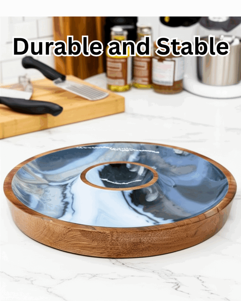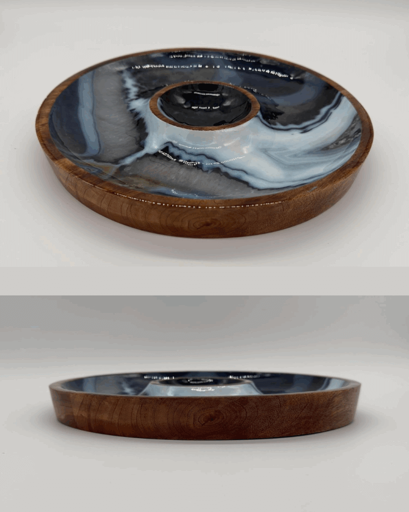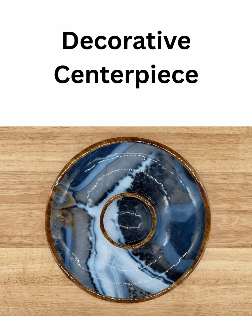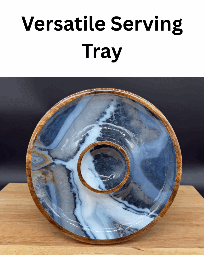 When not in use, the tray’s polished wooden exterior and glossy, marbled resin interior—featuring swirling shades of blue, black, white, and gray—make it a striking decorative piece that complements various decor styles, from rustic to modern.